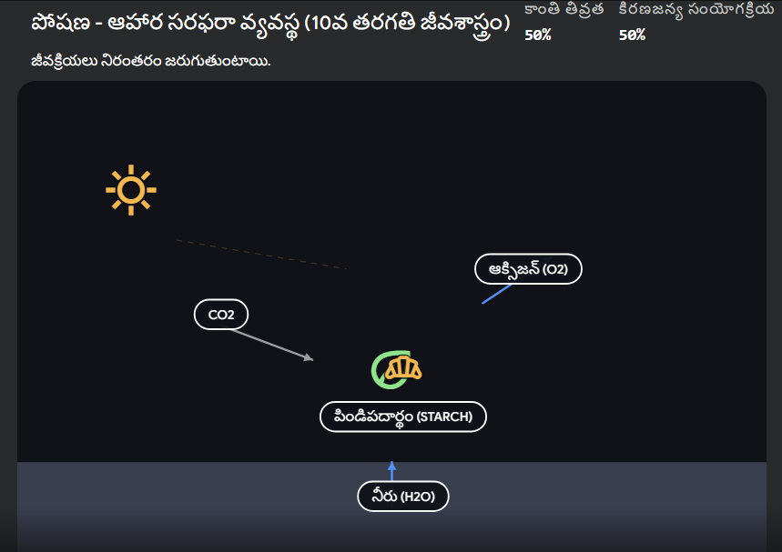 మొక్కలు సూర్యరశ్మి మరియు పత్రహరితం (Chlorophyll) సమక్షంలో వాతావరణంలోని కార్బన్ డై ఆక్సైడ్ ($CO_2$) మరియు నేల గుండా గ్రహించిన నీటిని ($H_2O$) ఉపయోగించి గ్లూకోజ్ (ఆహారం) మరియు ఆక్సిజన్ను ఉత్పత్తి చేసే ప్రక్రియను ‘కిరణజన్య సంయోగక్రియ’ అంటారు.