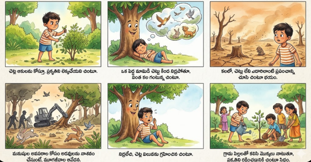 ఒకానొక గ్రామంలో చింటూ అనే చిన్న బాలుడు ఉండేవాడు. చింటూకి ప్రకృతి అంటే అస్సలు ఇష్టం ఉండేది కాదు. తోటలోకి వెళ్తే మొక్కల ఆకులను కోయడం, పూలను చిదిమేయడం, చెట్లపై రాళ్లతో కొట్టడం అతనికి అలవాటు. “ఈ చెట్లు కేవలం గాలిలో నిలబడి ఉంటాయి తప్ప, మనకు ఏమీ ఇవ్వవు” అని అతను అనుకునేవాడు.